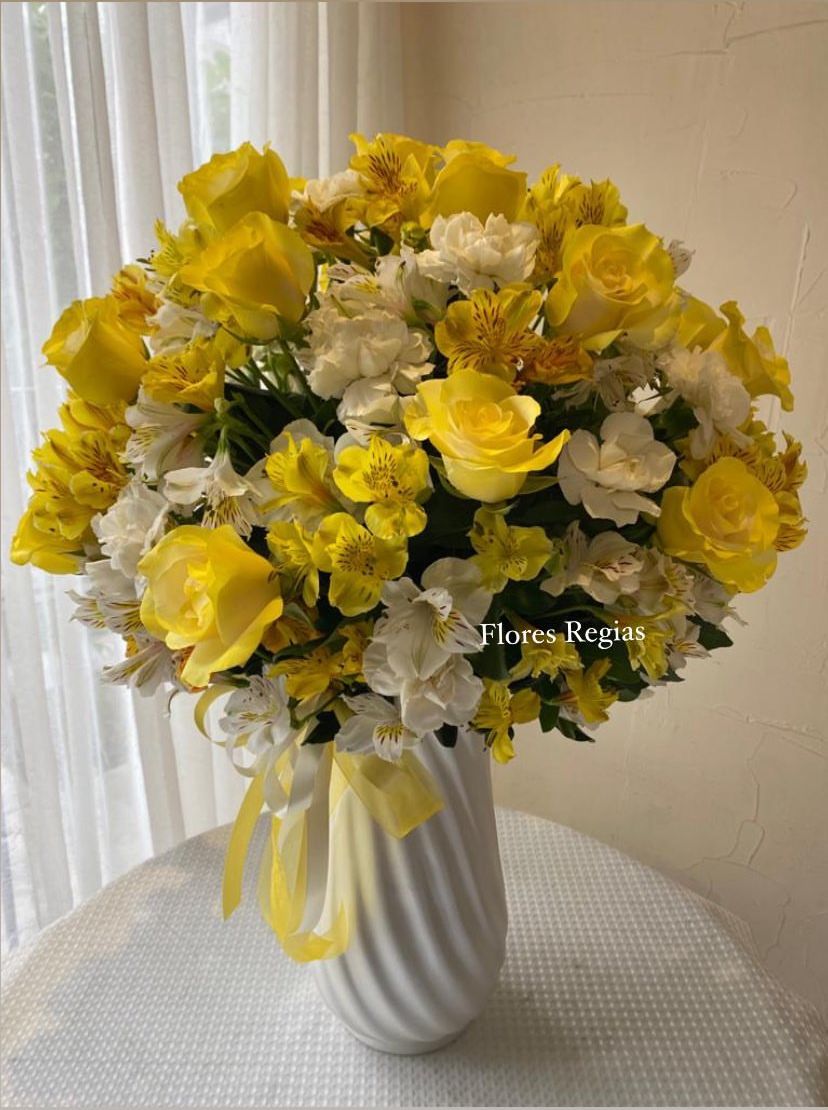 24 rosas amarillas y complementos en florero espiral perla