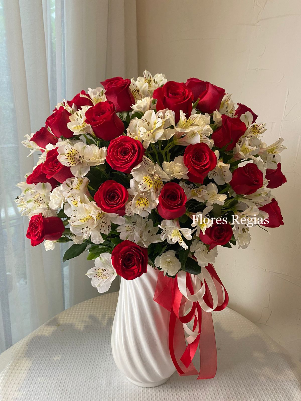 Con 36 rosas, Alstromelias y Claveles.