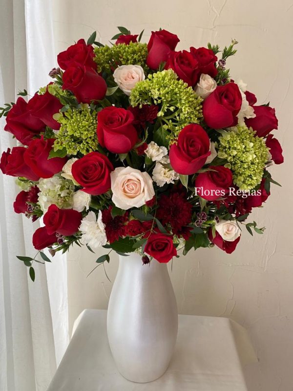 Con 50 rosas rojas, hortensias verdes, mini rosas, y variedad de flores y follajes.