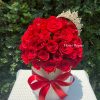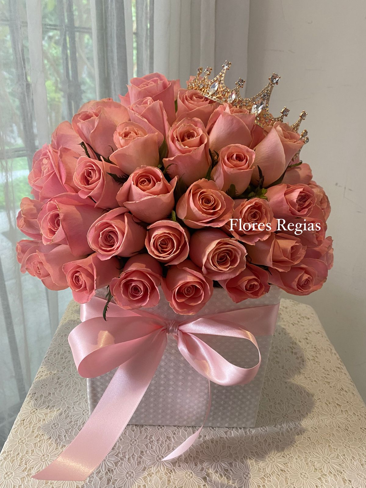 Hermosa Caja blanca con moño de 75 rosas rosas & corona
