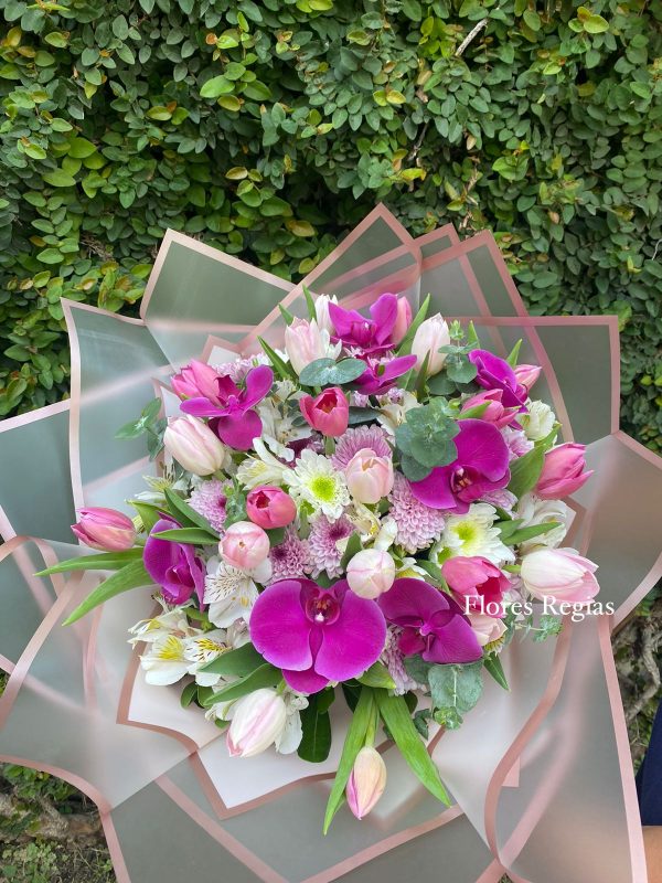 NOTA: El color de los tulipanes y orquídeas varia dependiendo la disponibilidad, el papel y listón se combinan con los tonos de los tulipanes para que exista armonía entre ellos.