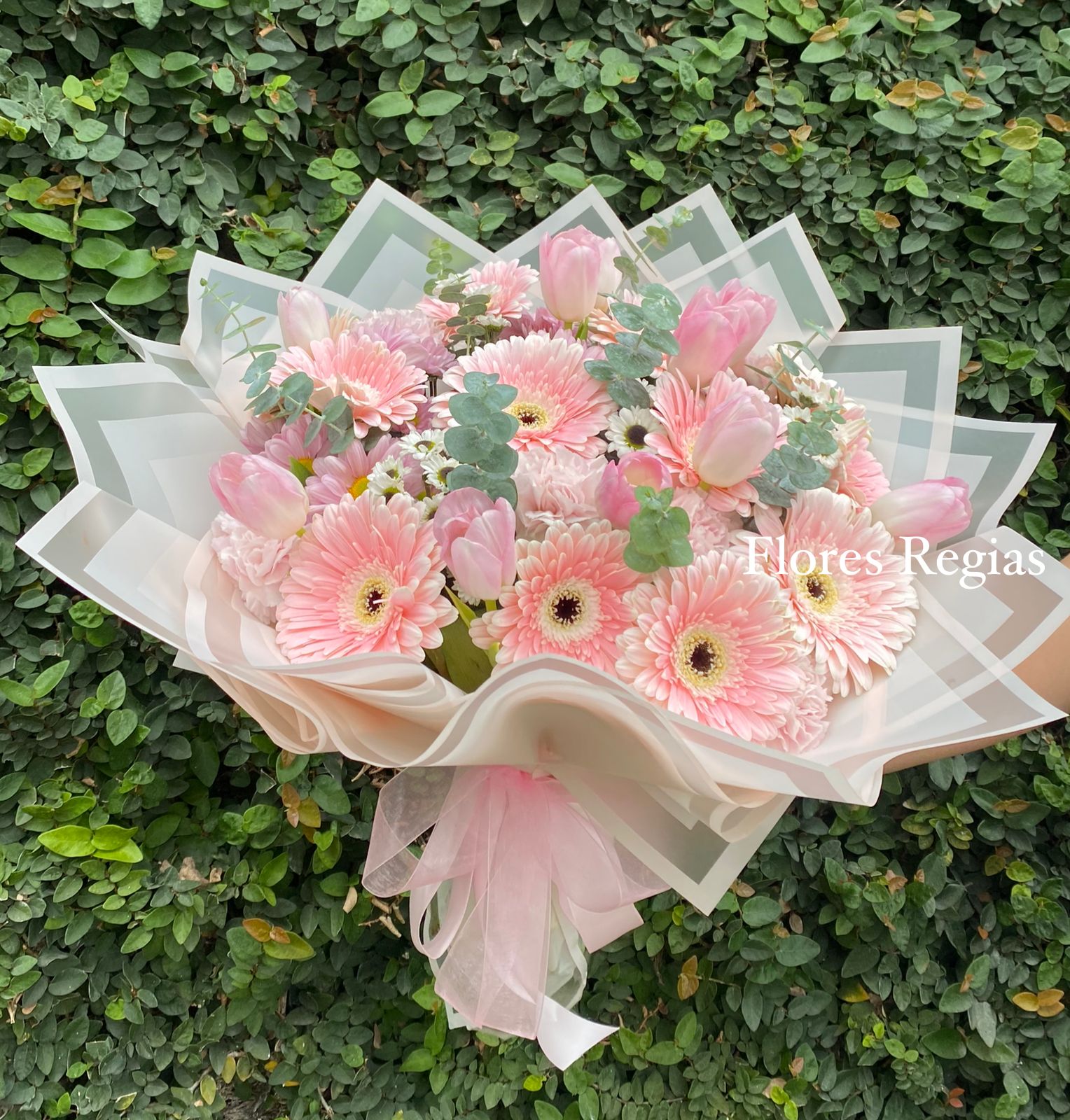 NOTA: El color de las flores varia dependiendo la disponibilidad, el papel y listón se combinan con los tonos de las flores para que exista armonía entre ellos.