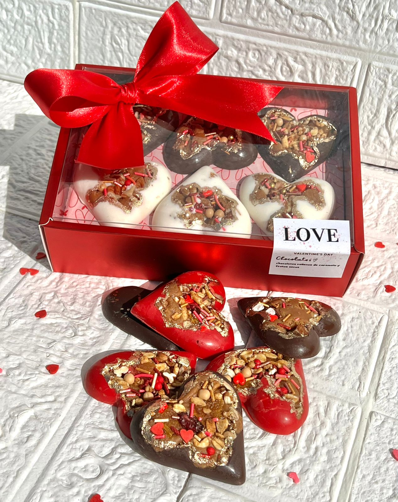 Caja de 12 chocolates rellenos de caramelos y frutos secos