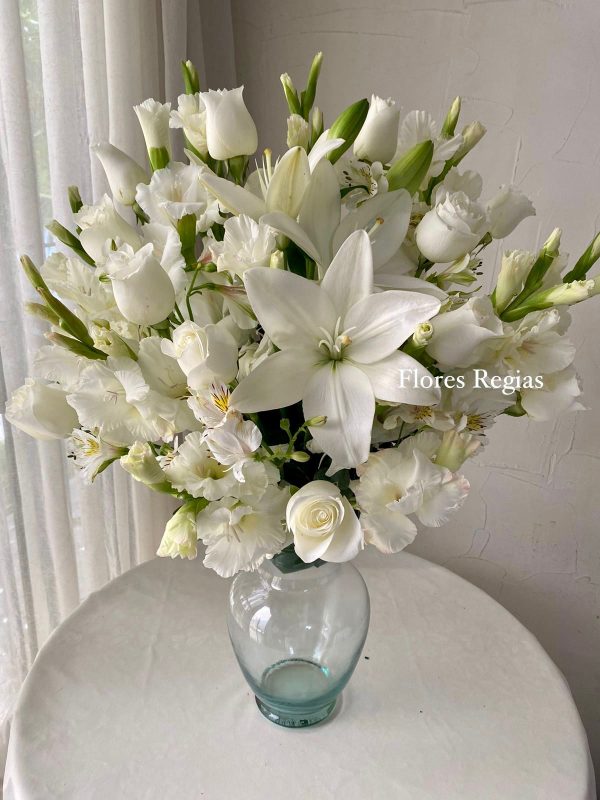 Elegante arreglo elaborado con gladiolas, 12 rosas blancas, clavellinas, astromerias, flores blancas y follajes, sobre una base blanca de cristal alta y elegante.
