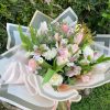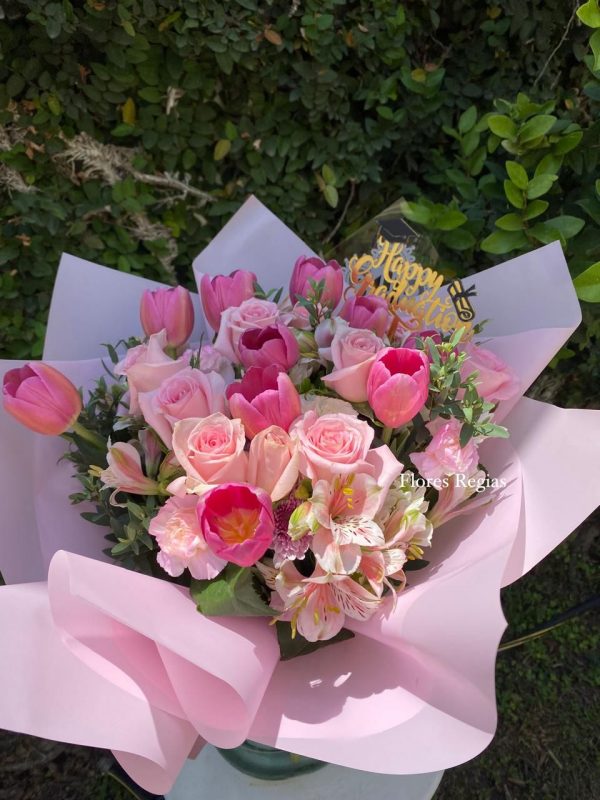 NOTA: El color de los tulipanes varia dependiendo la disponibilidad, el papel y listón se combinan con los tonos de los tulipanes para que exista armonía entre ellos.