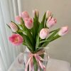 Hermosos y finos tulipanes en un florero de cristal, decorado con un moño de organza.