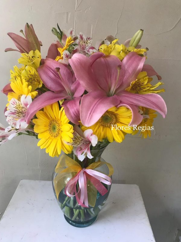 Arreglo multicolor en florero mediano con 10 gerberas, lilis y astromerias.